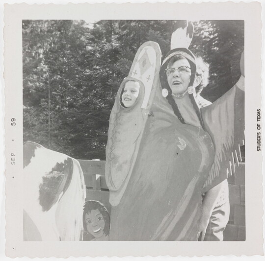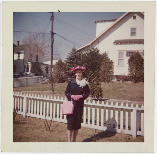 [Woman in black dress with pink hat, gloves, and purse], 1960s