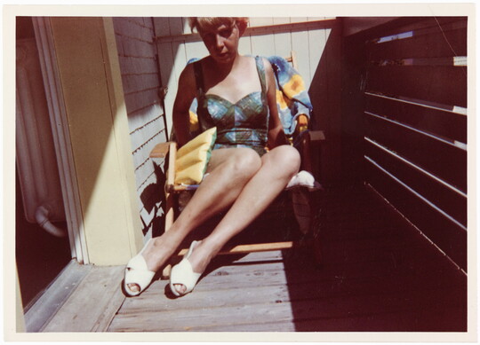 [Woman in Lawn Lounge Chair Lifting Yellow Skirt], 1960s