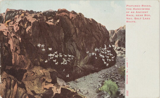 Pictured Rocks, the Handiwork of an Ancient Race, near Rox, Nev. Salt Lake Route., ca. 1905