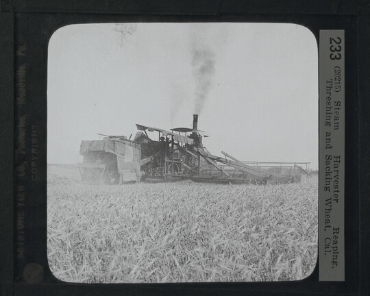 Steam Harvester Reaping, Threshing and Sacking Wheat, Cal., ca. 1915-1920