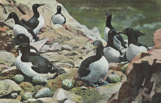 Sticking to Duty, Mother Murres at Close Range The North West Colony, Carroll Island, West Coast of Washington., ca. 1910