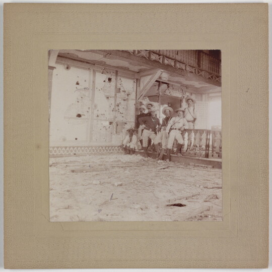 [Group of soldiers gathered under awning], ca. 1898-1902