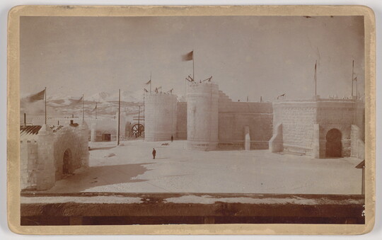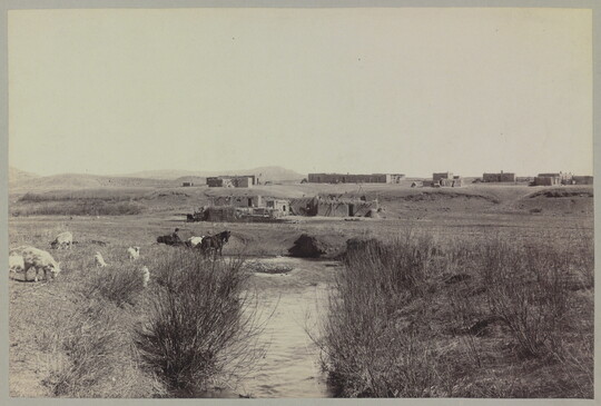 [Landscape with goats, wagon, and adobe village], ca. 1880-1900