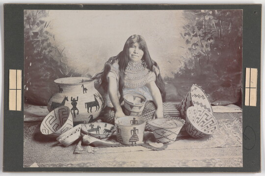 [Native American woman posing with hand-crafted baskets], ca. 1880-1900