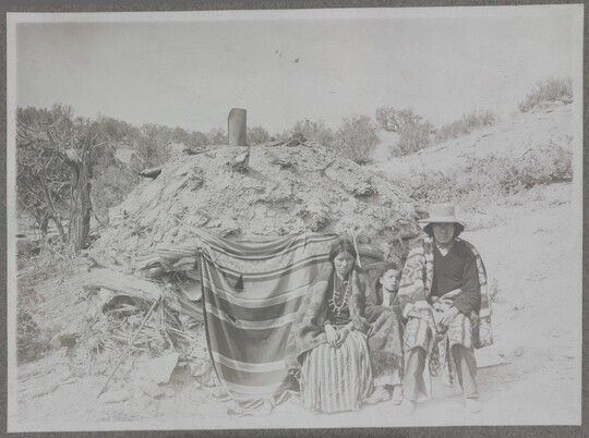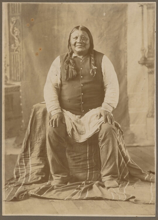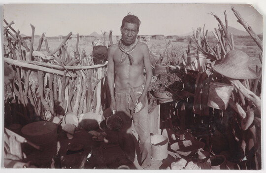 [Portrait of Pima cook with pails and pans], ca. 1880-1900