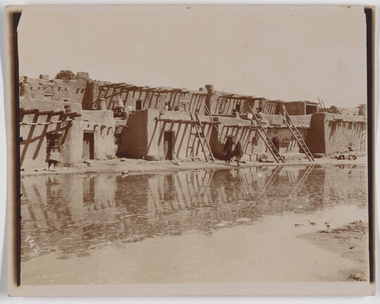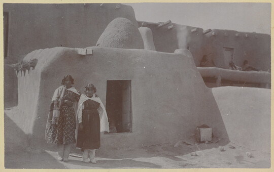 [Portrait of two Native American women in front of adobe house], ca. 1880-1900