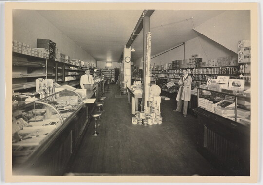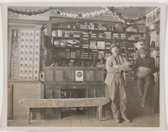 [Two men in store interior, Hudson, Colorado], 1930