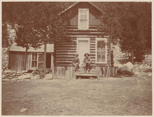 [Two men sitting in front of a log cabin], ca. 1878-1900