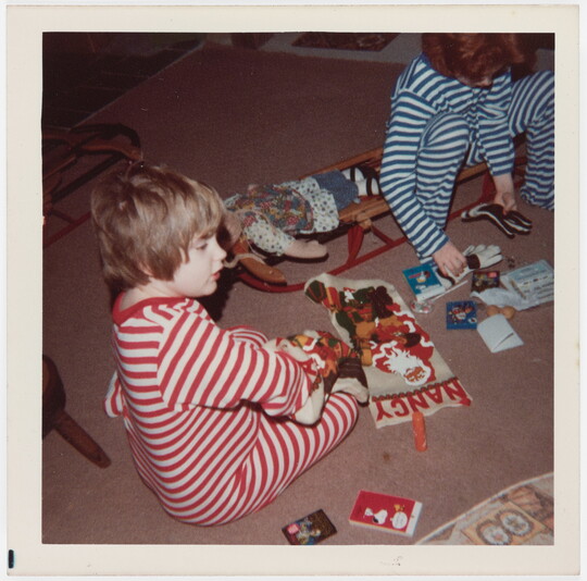 [Two children in striped pajamas with christmas stockings], late 1970s