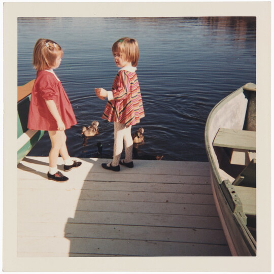 [Two girls on dock with ducks], ca. 1968