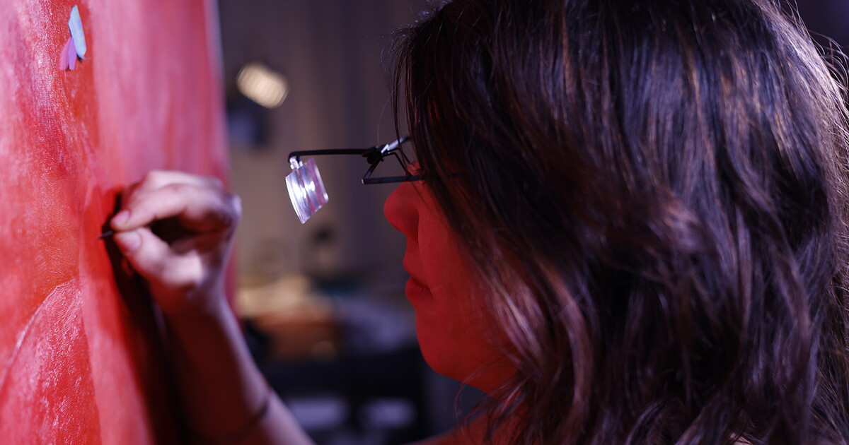 This is me cleaning Red Cannas using a quill and magnifying lenses.