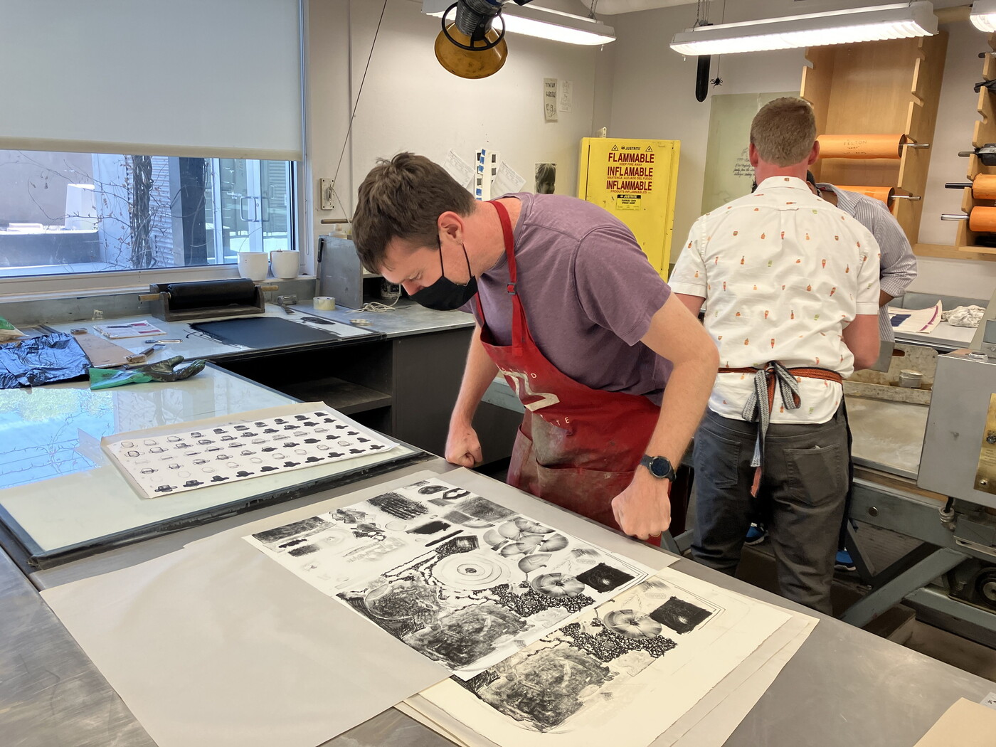 Prior to visiting Tamarind, I had a basic grasp of how lithographs were made. (This video from National Museums Liverpool offers a useful overview). But I’d never seen the process in person. Fortunately, Tamarind gave us a crash course. Over two days, Master Printer Brandon Gunn walked us through the steps of designing, preparing, and printing our own lithographs, with help from Apprentice Printers Andreea Cristina Mateescu and Maxwell Roath.