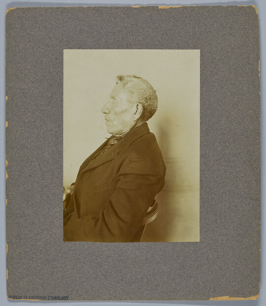 In 1879, Congress established the Bureau of Ethnology, later the Bureau of American Ethnology (BAE), to collect and maintain Euro-American knowledge about Indigenous nations. Led by surveyor John Wesley Powell, the Bureau’s archaeologists, anthropologists, linguists, and researchers were motivated by the false “vanishing race” theory, which held that Indigenous ways of life were doomed to fade away and consequently needed to be studied and documented. The BAE gathered thousands of existing photographs and continued to generate more—especially of Native diplomats who came to Washington, DC, to negotiate with the U.S. government—until it merged with other Smithsonian Institution divisions in the 1960s.