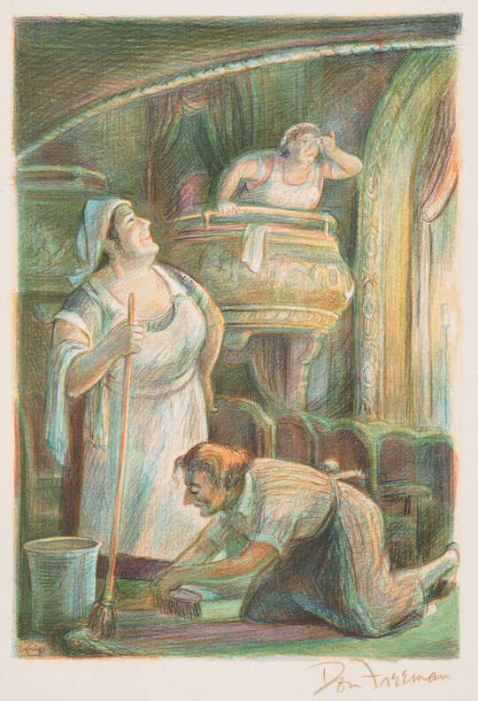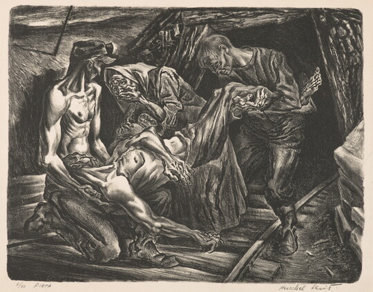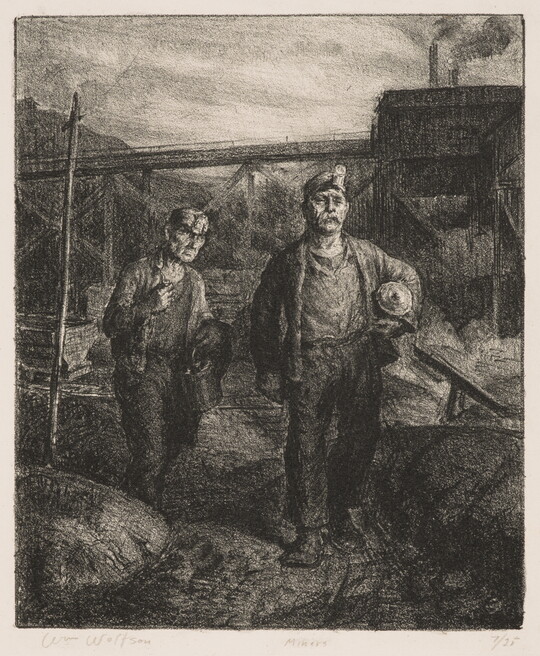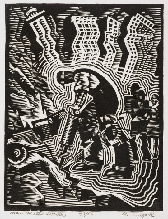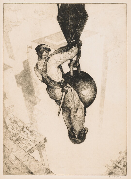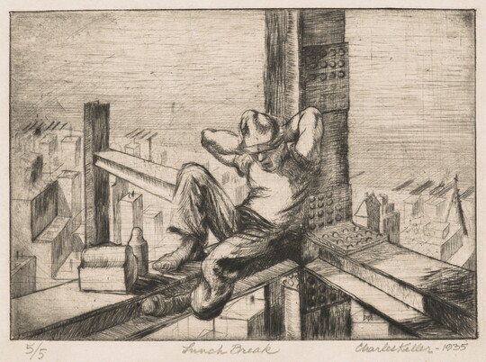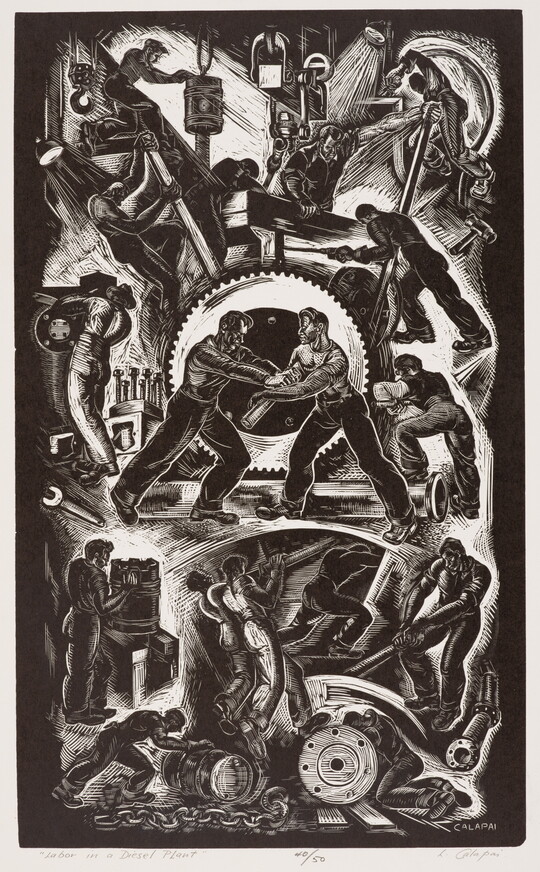 The Carter’s American Labor Prints Collection offers a unique glimpse into the imagery of working life from the 1920s through the 1940s. Acquired from a private collection in 1998, the 113 prints in this group portray workers, mostly men, from a range of professions, including mining, industrial construction, meat processing, and metalworking. Many of these works were created in the workshops of the Graphic Arts Division, a federally funded program that provided studio space, materials, and training for printmakers during the Great Depression. Notable artists include Reginald Marsh, Harry Sternberg, and Harry Gottlieb. Lithographs comprise the bulk of the collection, but strong examples of etchings, screen prints, and linocuts are present as well, along with several drawings and watercolors.