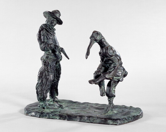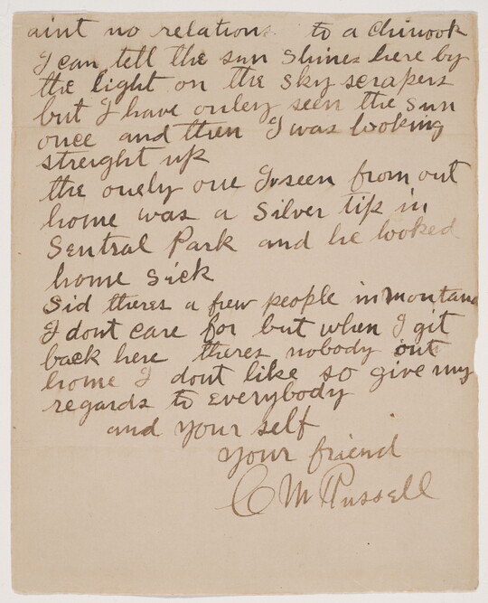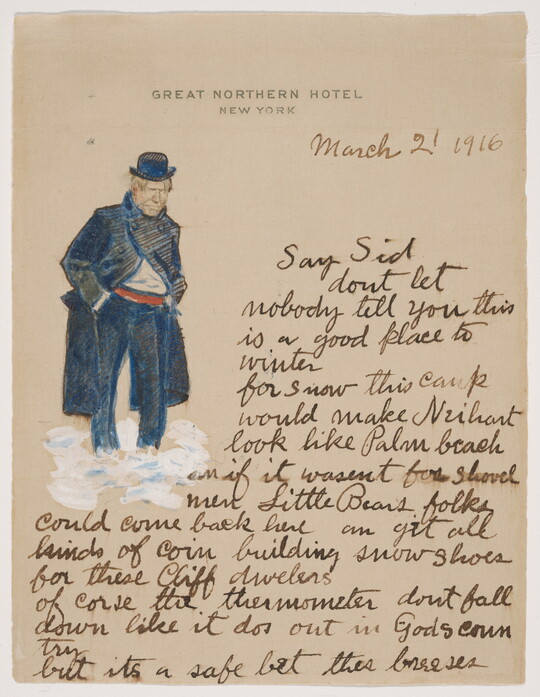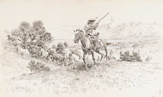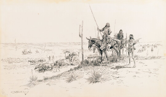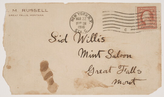 Mr. Carter began collecting art in 1935, when he acquired His First Lesson along with a group of nine Russell watercolors. His collection quickly expanded to include some of the artist’s best-known works. In 1941, he acquired a selection of artworks from the estate of Russell’s widow, Nancy Cooper Russell. Four years later, he purchased A Dash for the Timber from Washington University in Saint Louis, and in 1948 he acquired Buffalo Hunt [No. 39], a picture formerly owned and beloved by Rogers. In 1964, Cyrus Rowlett (C. R.) Smith, a close friend of Mr. Carter’s and the president of American Airlines, gifted a selection of Russell sculptures and illustrated letters to the museum, further enriching what was already one of the finest museum collections of Russell’s and Remington’s art.