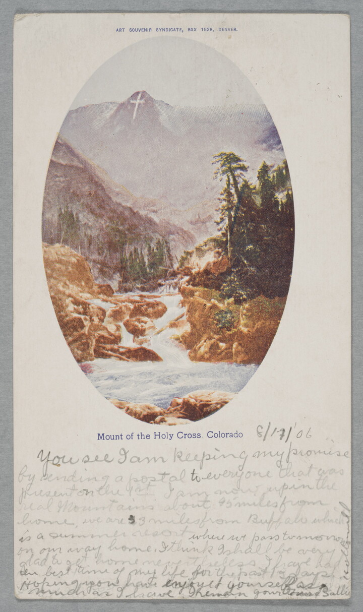 Amateur historian Fred Mazzulla spent decades building a collection of visual material about the history of Colorado, including photographs, negatives, postcards, and memorabilia, and the Carter retains over 6,000 works from his collection. The material addresses the settlement of the state by White Americans, with special focus on landscape views, early towns, and industries like railroads and mining, and includes significant bodies of work by W. J. Carpenter, Joseph Collier, and William Henry Jackson. Other works from the Mazzulla Collection were transferred from the Carter to the Colorado State Historical Society