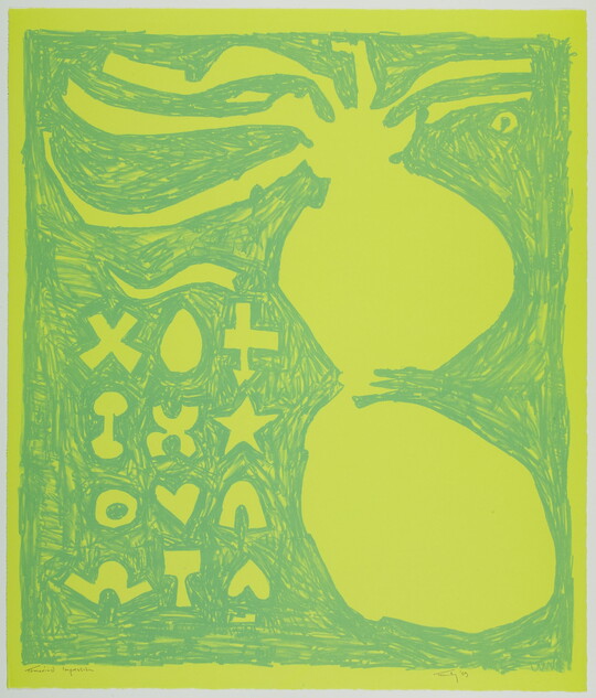 Founded by artist June Wayne in Los Angeles in 1960, the Tamarind Lithography Workshop was an effort to revitalize the printmaking medium of lithography as a fine art in the United States. Through artist residencies and fellowships, Tamarind trained a pool of master artisan-printers in the United States and offered visiting artists of diverse styles an opportunity to learn and work with the medium. (The program, now known as the Tamarind Institute, continues today at the University of New Mexico.)