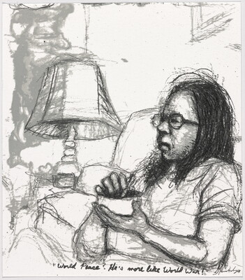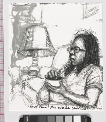l.c. in black ink: "World Peace? He's more like World War!"