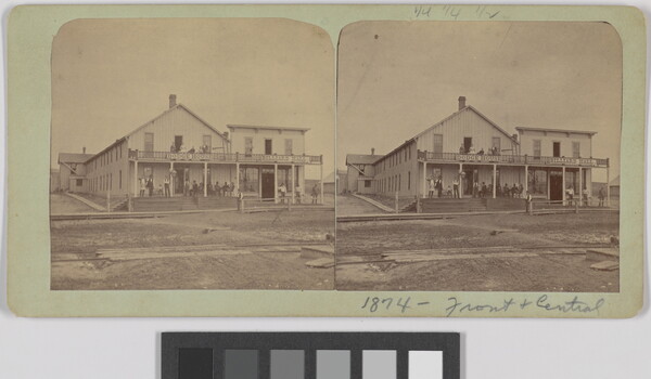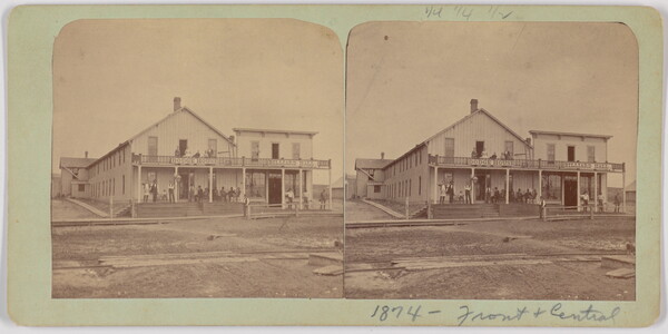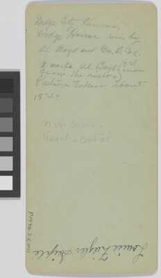 l.l. to u.l. in graphite: Dodge City, Kansas \ Dodge House run by \ Al Boyd and Geo. B. Cox. \ X marks Al Boyd. (3rd man \ from the right) \ picture taken about \ 1874=