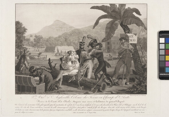 l.l. to l.r.: 2eme. Vue d'Aigleville, Colonie due Texas ou Champ d'Asile. / Riviere de la Trinite, Fort Charles, Magasin aux vivres et habitation du general Rigaud. / Na. L'arrrivee des nouveaux Colons fut signalee par la construction de 4 forts. Le 1er sous le nom de Charles le 2e. sous celui du milieu le 3e. Henri et le 4e. Palanque sur le bord de la / riviere. Les cotes du Texas sont basses. couvertes du sable et marecageuses. La Colonie etait placee entre le Golfe du Mexique d'un cote et les rivieres de la Sabine et de Barofso / de l'autre au centre deux ruisseaux et des prairies dans une temperature semblable a celle du midi. 400 refugies commencaient ay gouter le repos, lorsque les Espagnols marchierent sur eux - / pour les obliger a se retirer.