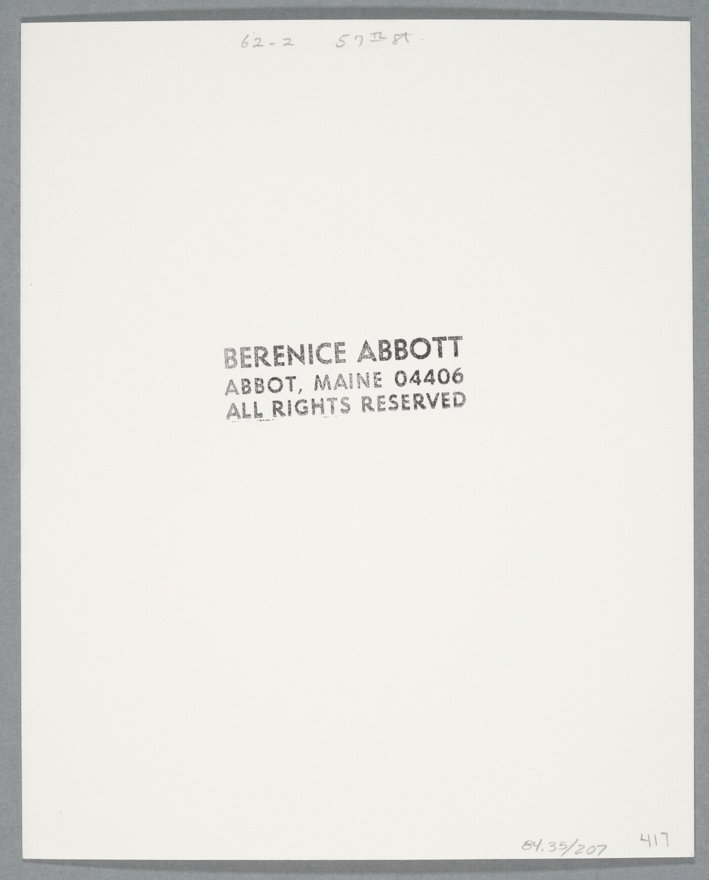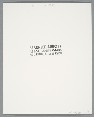 c. [stamp]: BERENICE ABBOTT \ ABBOT, MAINE 04406 \ ALL RIGHTS RESERVED