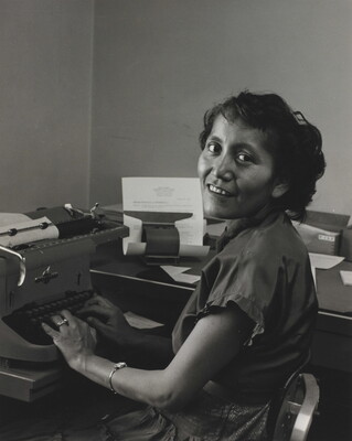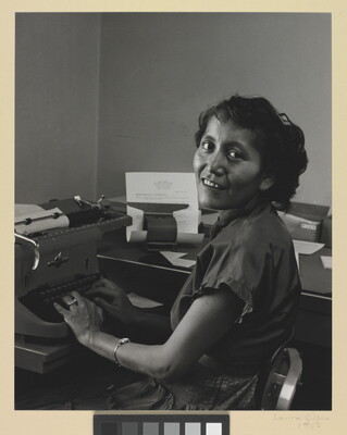 u.c. on paper label: [printed]: A PHOTOGRAPH BY \ LAURA GILPIN \ SANTA FE, NEW MEXICO \ [typed]: AGNES DRAPER, A SKILLED TYPIST \ [in ink]: 1955 \ From THE ENDURING NAVAHO \ University of Texas Press, Pub. 1968