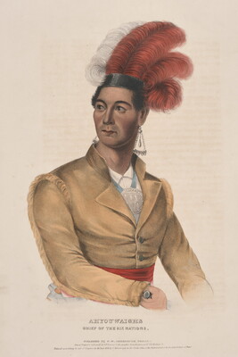 l.c.: AHYOUWAIGHS \ CHIEF OF THE SIX NATIONS. \ PUBLISHED BY F.W. GREENOUGH, PHILAD[A]. \ Drawn Printed & Coloured at J.T. Bowen's Lithographic Establishment N[o]. 94 Walnut St: \ Entered according to act of Congress in the Year 1838 by F.W. Greenough, in the Clerks Office of the District Court of the Eastern District of Penn[a].