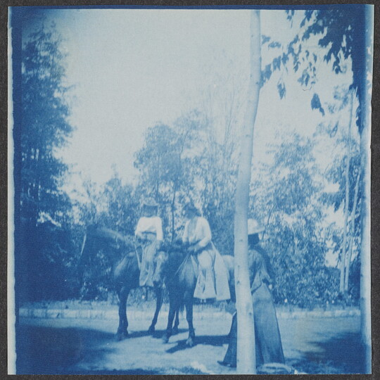 [Two women mounted on horses, another looking on], ca. 1900-1910