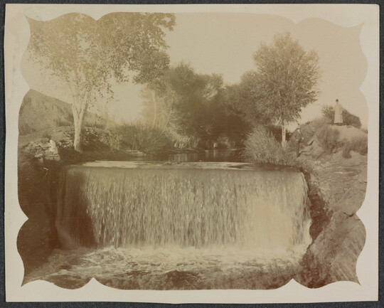 [Small waterfall with two people on riverbank], ca. 1900-1910