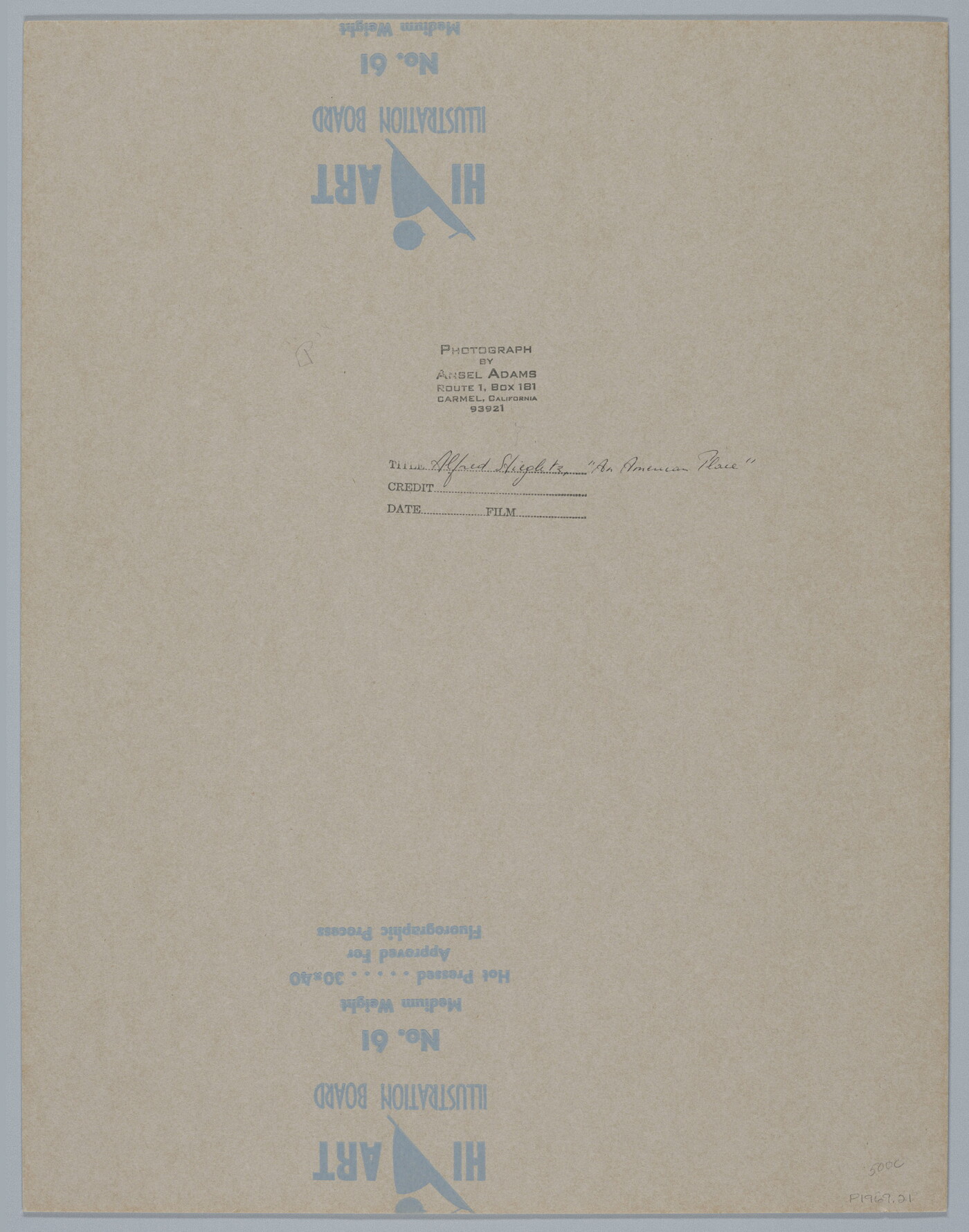 c. [stamp]: TITLE Alfred Stieglitz, "An American Place" \ CREDIT \ DATE FILM