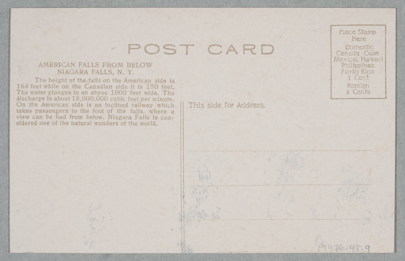 u.l. printed: AMERICAN FALLS FROM BELOW \ NIAGARA FALLS, N.Y. \ The height of the falls on the American side is \ 164 feet wide on the Canadian side it is 150 feet. \ The water plunges in an abyss 1000 feet wide. The \ discharge is about 18,000,000 cubic feet per minute. \ On the American side is an inclined railway which \ takes passengers to the foot of the falls, where a \ view can be had from below. Niagara Falls is con- \ sidered one of the natural wonders of the world.