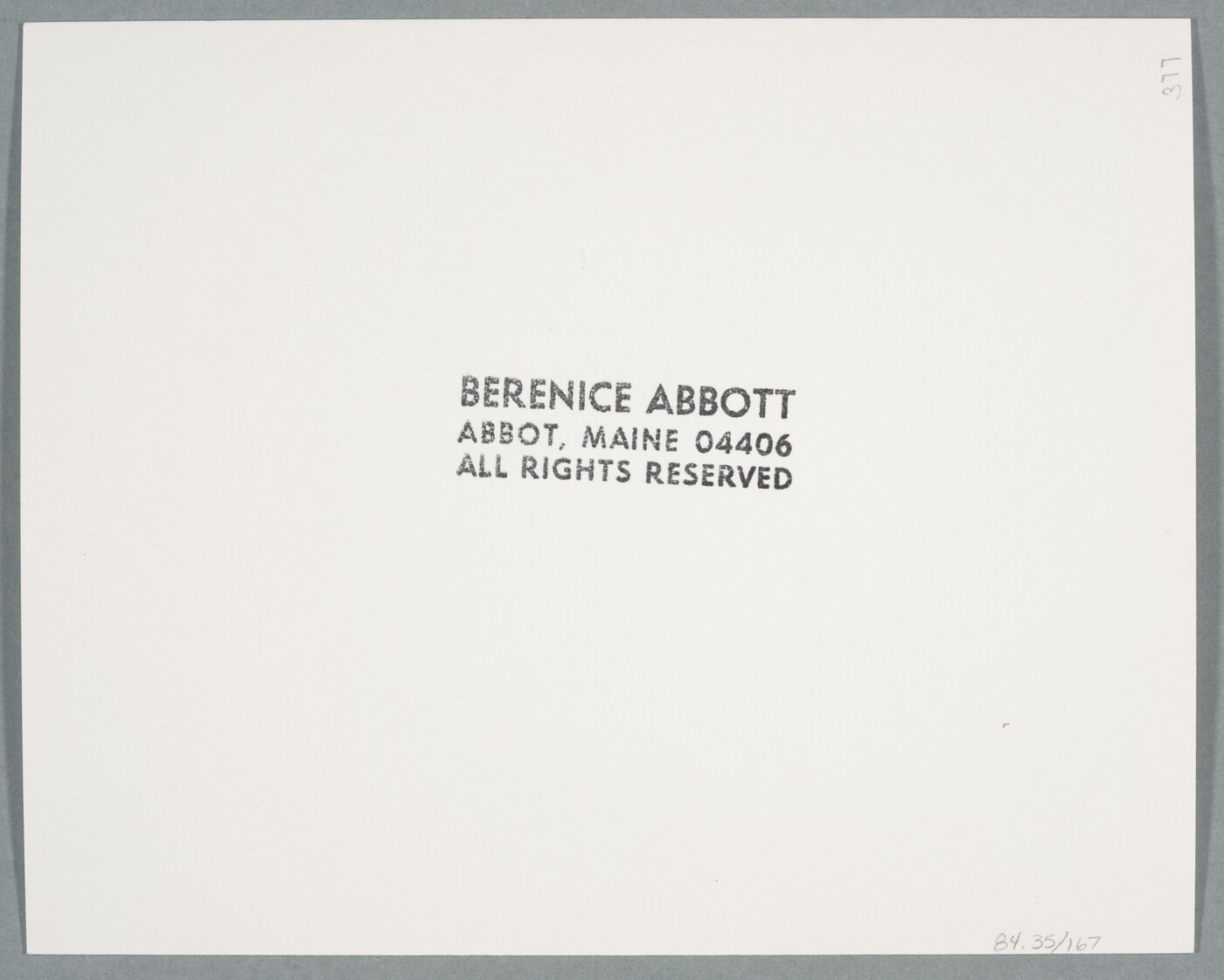 c. stamp: BERENICE ABBOTT \ ABBOT, MAINE 04406 \ ALL RIGHTS RESERVED