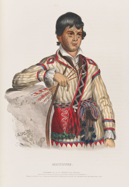 l.c. engraved on stone: AMISKQUEW. \ A MENOMINIE WARRIOR. \ PUBLISHED BY DANIEL RICE & JAMES G. CLARK, PHILAD.A \ Drawn Printed & Col.d at the Lithographic & Print Colouring Establishment, No. 94, Walnut St. Phila \ Entered according to act of Congress in the Year 1843, by James G. Clark, in the Clerk's Office of the District Court of the Eastern District of Pennsylvania.