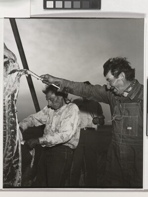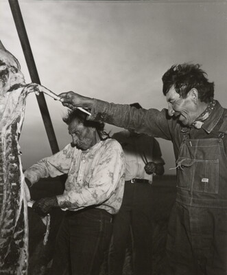 u.c. in graphite: Andrew Knife and Thomas \ Steals Horses \ dressing out buffalo meat for the \ fair.