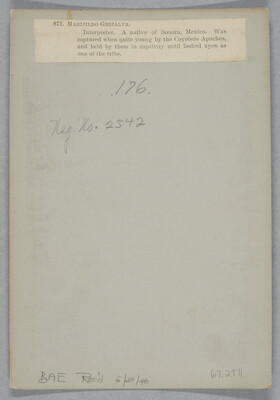 u.l. to u.r. printed on label: 871 MARIJILDO GRIJALVA. \ Interpreter. A native of Sonora, Mexico. Was \ captured when quite young by the Coyotero Apaches, \ and held by them in captivity until looked upon as \ one of the tribe.