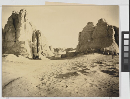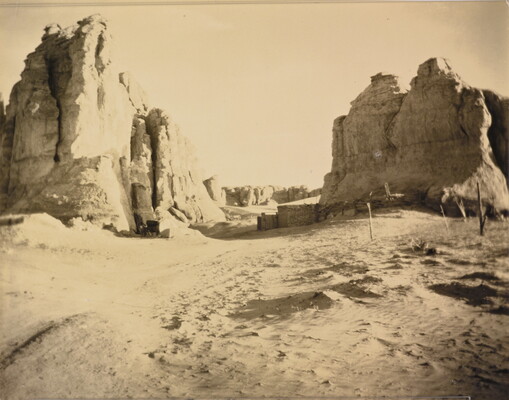 u.l. to c.l.: The Approach to Acoma \\ At the foot of the rock all vehicles have \ to be abandoned. The path leading to the \ pueblo first follows the slowly rising crest \ of a sand dune, which curves along the foot \ of the rock, then it stops, and one climbs \ the almost perpendicular rock along well worn \ footholds hewn in the soft rock xxxxxxxxxxxxxxx \ clinging to the little projections and hollows, \ where thousands of other hands have left their \ imprint.