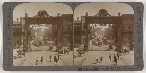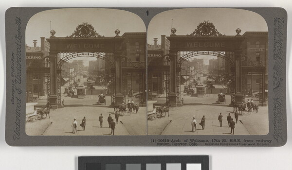 l.c. to l.r. printed: (1)-10610- Arch of Welcome. 17th St. E.S.E. from railway \ station. Denver, Colo. Copyright Underwood & Underwood. U-118683