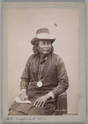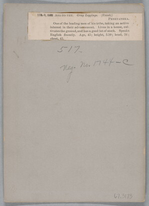 u.c. to u.r. printed on paper label: 138-9, [8 crossed out], 146 [crossed out] ASA-TO-YET. Gray Leggings. (Front.) \ PENETATHKA. \ One of the leading men of his tribe, taking an active \ interest in their advancement. Lives in a house, cut- \ tivates the ground, and has a god lot of stock. Speaks \ English fluently. Age, 45; height, 5.10; head, 34; \ chest, 42.