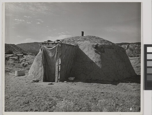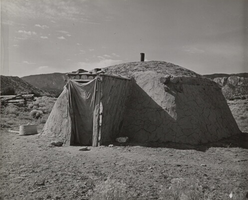c.r. in graphite and ink: Winter Hogan \ Aschi - Two Grey Hills \ par of corral for \ sheep visible in background \ Helen Post