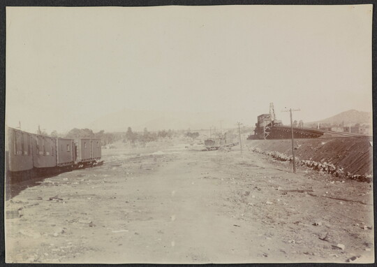 [Railroad tracks and box car], ca. 1900-1910