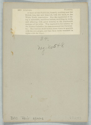 u.l. to u.r. printed on paper label: 1071 AUGUSTE. PEMBINA. \ A brave of the Pembinas, formerly residing near the \ British line, but now removed, with his band, to the \ White Earth reservation. Has the reputation of be- \ ing a miserable, worthless Indian, unwilling to work, \ and adhering with great tenacity to the heathenish \ cutoms of his tribe.Was baptized in his infancy by \ the Roman Catholics, but has renounced his Christian- \ ity. Has had his skull broken three times in quarrels \ with his own people, and has been twice wounded in \ fights with the Sioux.