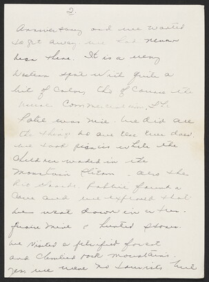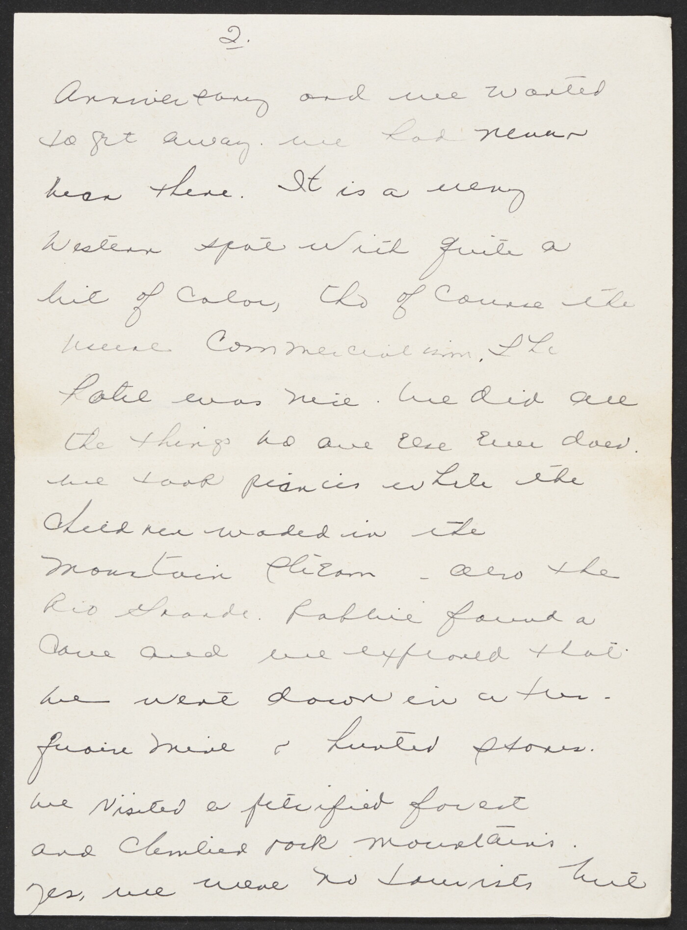 Autograph letter signed. First page is missing. Talks about an anniversary trip they took with the children and Robbie. Says the children waded in a mountain stream and also the Rio Grande. Tells that Robbie found a cave that they explored. Says she is glad Dorr is having such a good time in Spain. Tells that Texas is unbearably hot. Expresses concern that their hopes for Eisenhower are in vain.