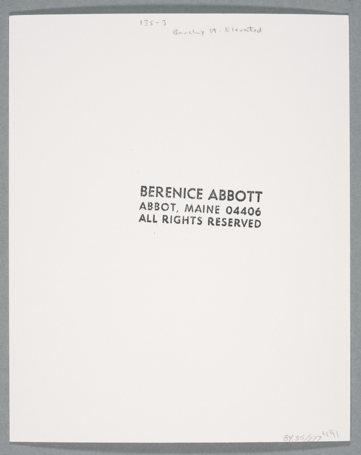 c. [stamp]: BERENICE ABBOTT \ ABBOT, MAINE 04406 \ ALL RIGHTS RESERVED