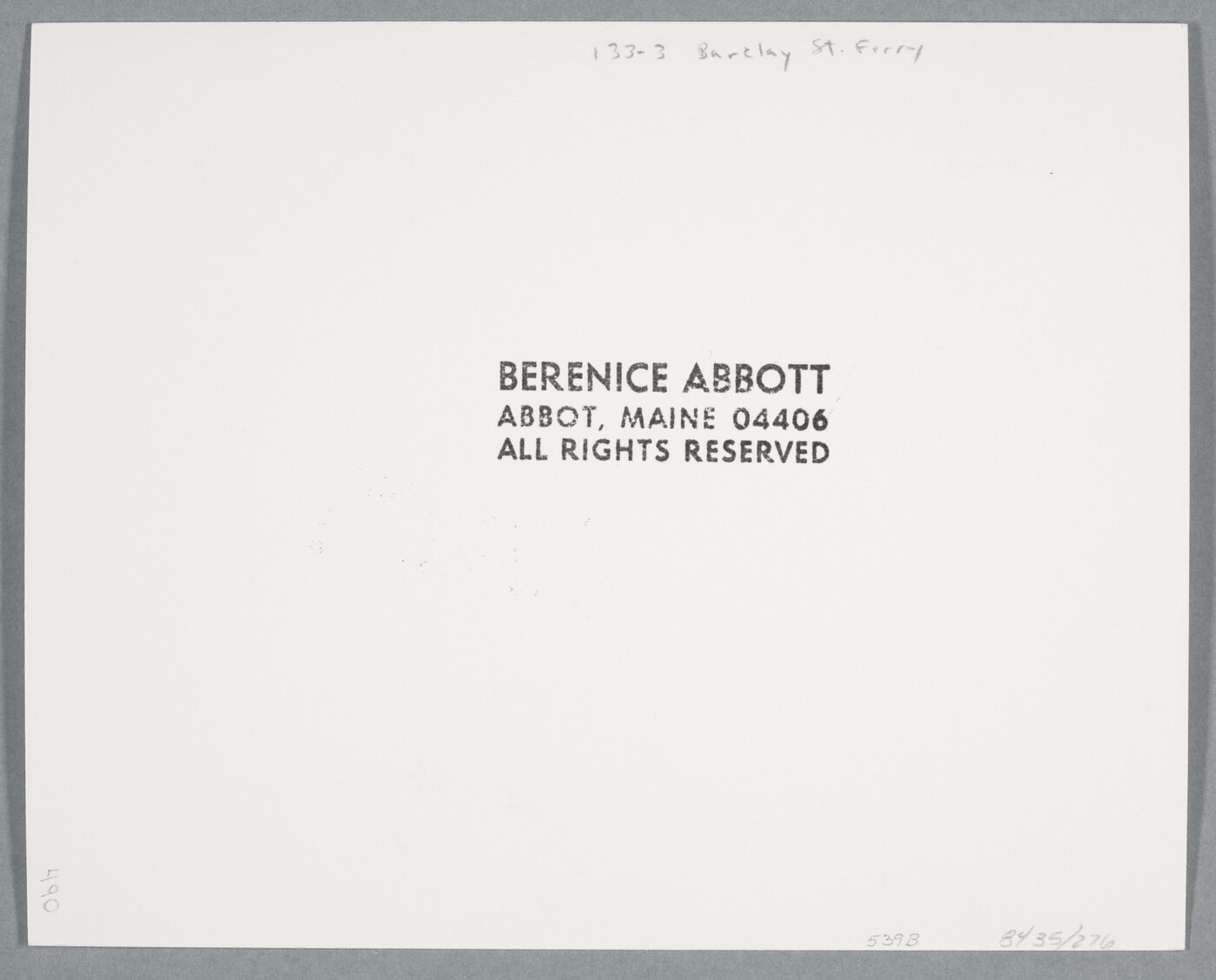 c. [stamp]: BERENICE ABBOTT \ ABBOT, MAINE 04406 \ ALL RIGHTS RESERVED