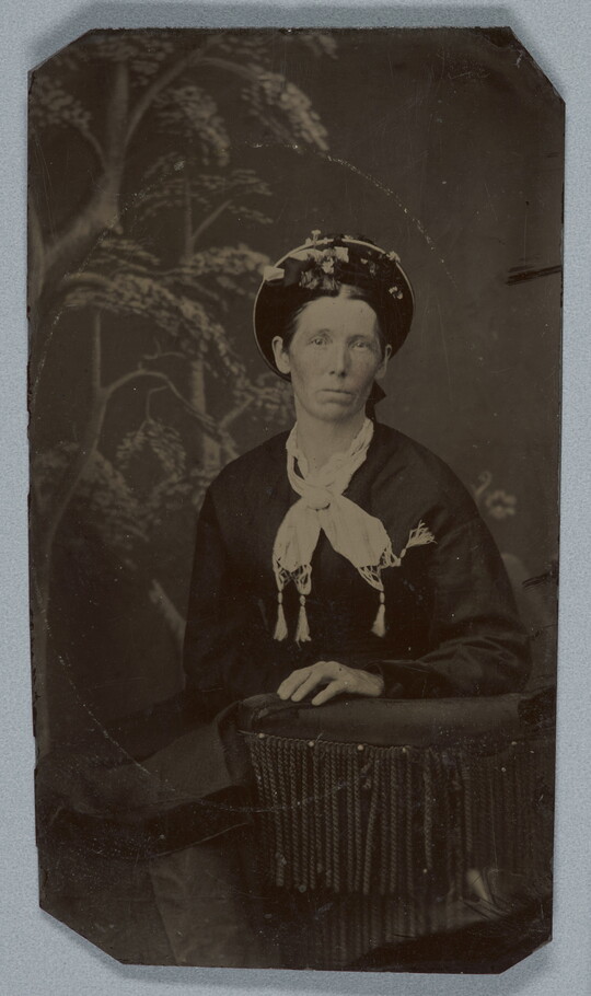 [Woman in hat and scarf, seated, half-length], ca. 1863-1875
