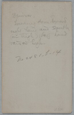 u.c. in graphite: Spinner; \ Looking down toward \ right hand and Spindle \ (on thigh); left hand \ raised high.