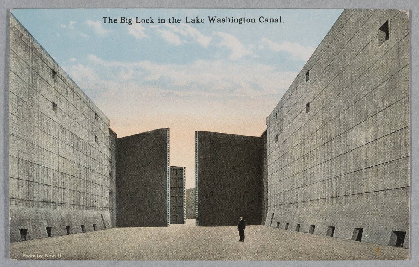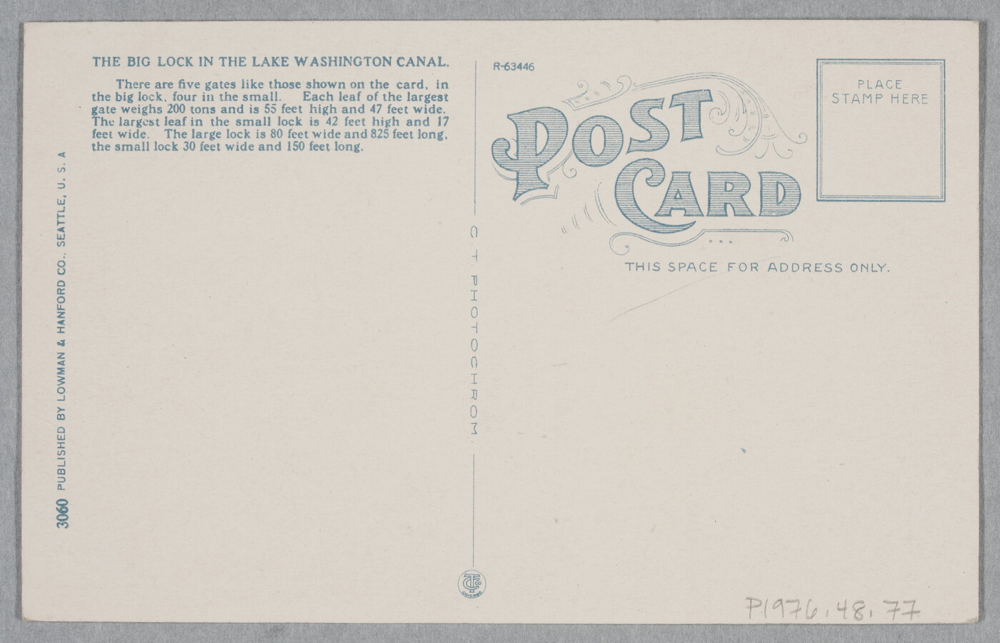 u.l. printed: THE BIG LOCK IN THE LAKE WASHINGTON CANAL. \ There are five gates like those shown on the card, in \ the big lock, four in the small. Each leaf of the largest \ fate weighs 200 tons and is 55 feet high and 47 feet wide. \ The largest leaf in the small lock is 42 feet high and 17 \ feet wide. The large lock is 80 feet wide and 825 feet long, the small lock 30 feet wide and 150 feet long.
