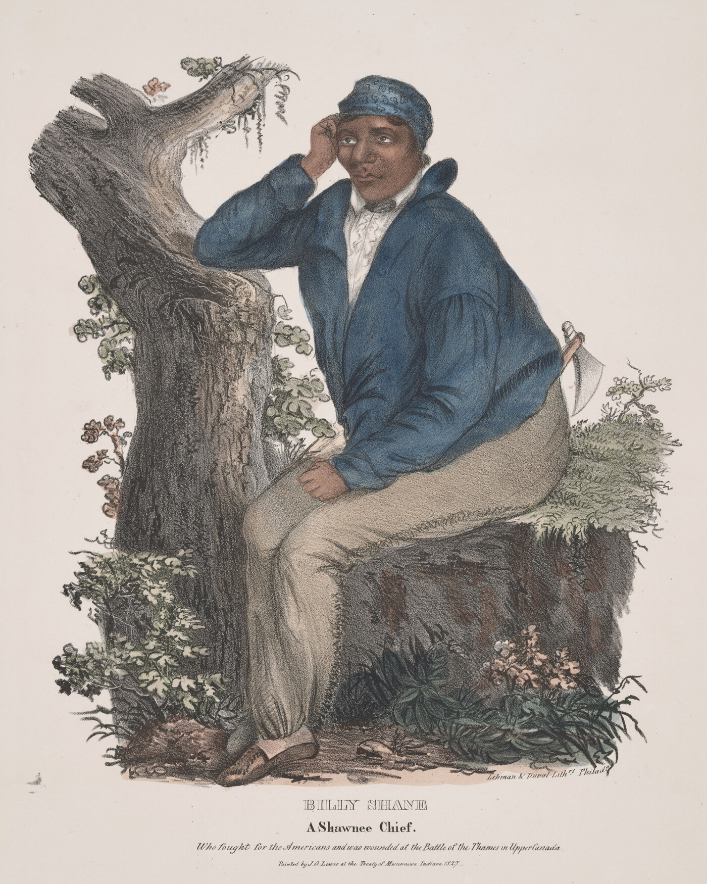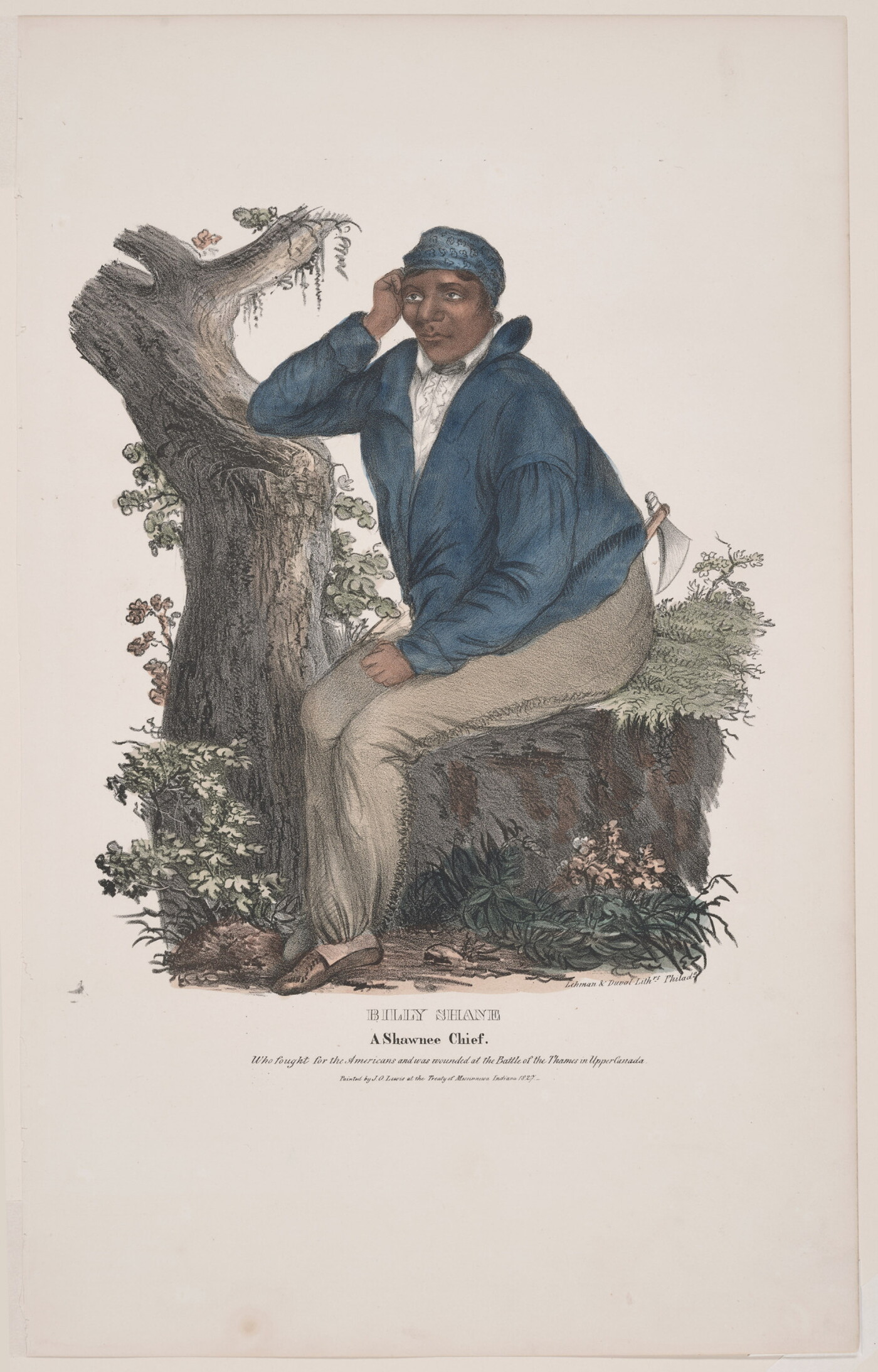 l.c.: BILLY SHANE \ A Shawnee Chief. \ Who fought for the Americans and was wounded at the Battle of the Thames in Upper Canada. \ Painted by J.O. Lewis at the Treaty of Messinnewa [sic] Indiana 1827._