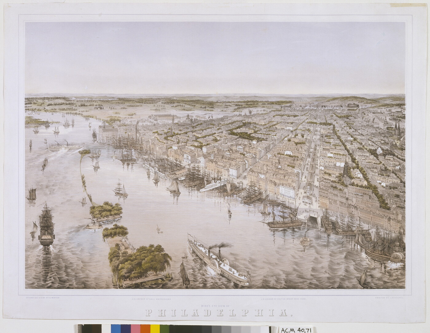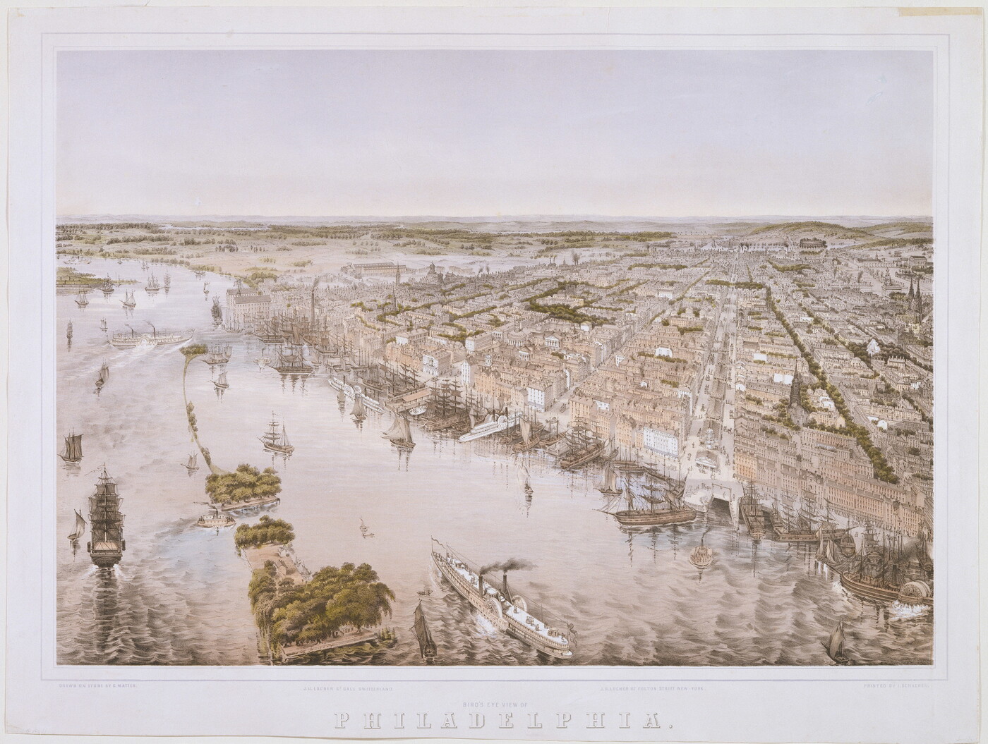 l.c.: J.U. LOCHER S[T]. G[or C]ALL SWITZERLAND. J.H. LOCHER 117 FULTON STREET NEW-YORK. \ BIRD'S EYE VIEW OF \ PHILADELPHIA.