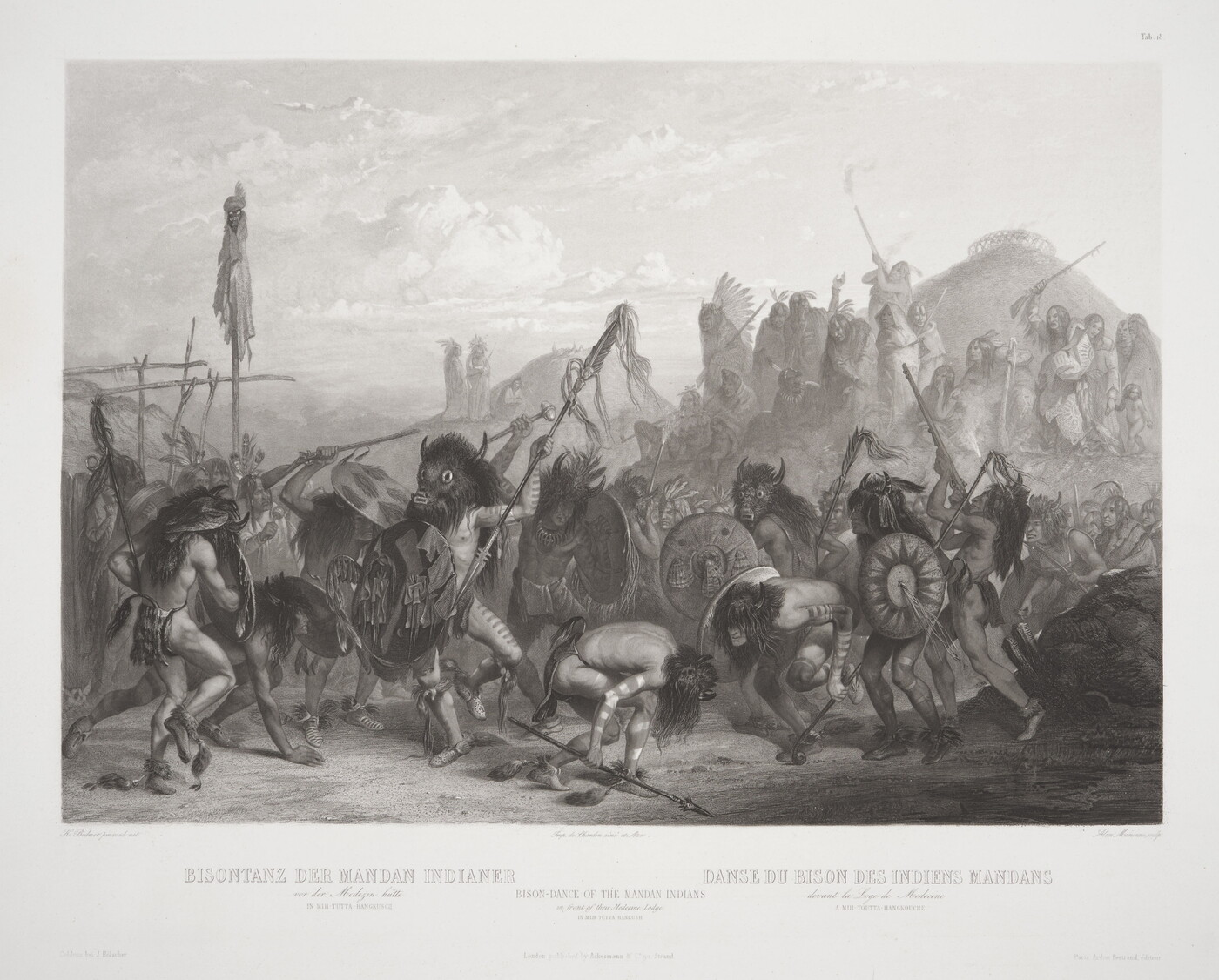 l.c.: Imp. de Chardon ainé et Aze. \ BISONTANZ DER MANDAN INDIANER DANSE DU BISON DES INDIENS MANDAN \ vor der Medez in hütte BISON-DANCE OF THE MANDAN INDIANS devant la Loge de Medecine \ IN MIH-TUTTA-HANGKUSCH. In Front of the their Medicine lodge A MIH-TOUTTA-HANGKOUCHE. \ IN MIH-TUTTA-HANGKUSCH. \ London published by Ackermann & Co. 90, Strand. \ [blind stamp (C. Bodmer\Direx)]
